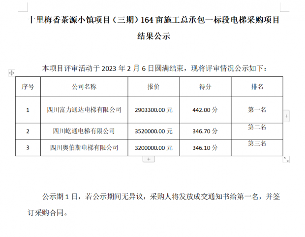 十里梅香茶源小鎮(zhèn)項目(三期)164畝施工總承包一標段電梯采購項目 結果公示